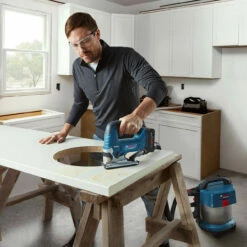 The Bosch GST 18V-125 B Bow Handled Jigsaw has a baseplate can be adjusted up to 45° to make bevel cuts