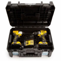 The Dewalt DCK2110L2T is a Sub Compact Brushless Twinpack offering some of the smallest, lightweight tools they have ever made with all the performance the end user needs to get the job done. Contains the DCD701 Drill Driver which delivers 57.5Nm of torque and a drilling capacity of 20mm in wood and 10mm in metal. Also the DCF801 Impact Driver with a tiny overall length of 126mm. Includes 2 x DCB124 3.0Ah Batteries, DCB112 Charger, 2 x Belt Hooks in a TSTAK Box.