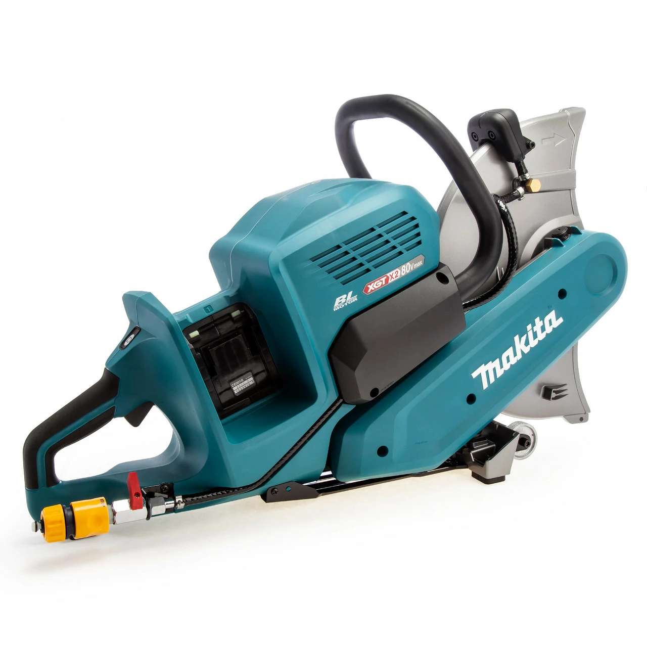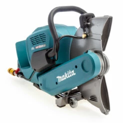 The Makita CE001GZ Twin 40V/80V XGT Brushless 355mm Disc Cutter is a powerful and versatile cordless power cutter that is ideal for a variety of applications, including cutting metal, concrete, masonry, and wood. It is powered by two 40Vmax XGT Li-Ion batteries in series and features an 80V Max brushless motor that delivers up to 3,600W maximum output and 5,300 rpm. The CE001GZ is fitted with an anti-vibration housing with a built-in spring to absorb vibration, and it has integrated front and rear handles. It is wet guard/IPX4 compatible and can be connected to a water supply kit (not included). It has a maximum cutting capacity of 127mm, enabling it to cut 8 to 10 rebars of 16mm at once. It also features a dust blower to keep the cutting area clear, and a work light to illuminate the workpiece.