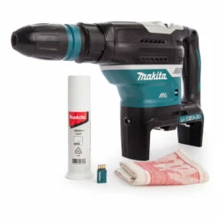 The Makita DHR400 is a 40 mm (1-9/16”) cordless rotary hammer powered by two 18V Li-Ion batteries. It is equipped with Auto-Start Wireless System (AWS) which connects to compatible dust extractors with Bluetooth. The dust extractor automatically runs while the switch is on. Sold as a body only machine without charger or batteries. Comes in a large Carry Case with 100ml of Grease and a Cloth.