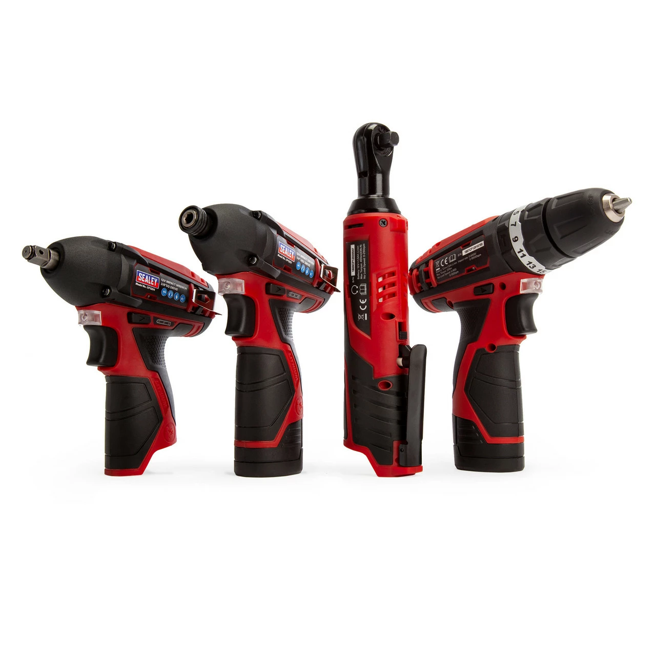 The Sealey CP1200COMBO is a 4 piece kit consisting of a combi drill, ratchet wrench, impact driver and an impact wrench, along with 2 batteries, a mains charger, all supplied in a canvas carry bag for ease of storage and transportation.