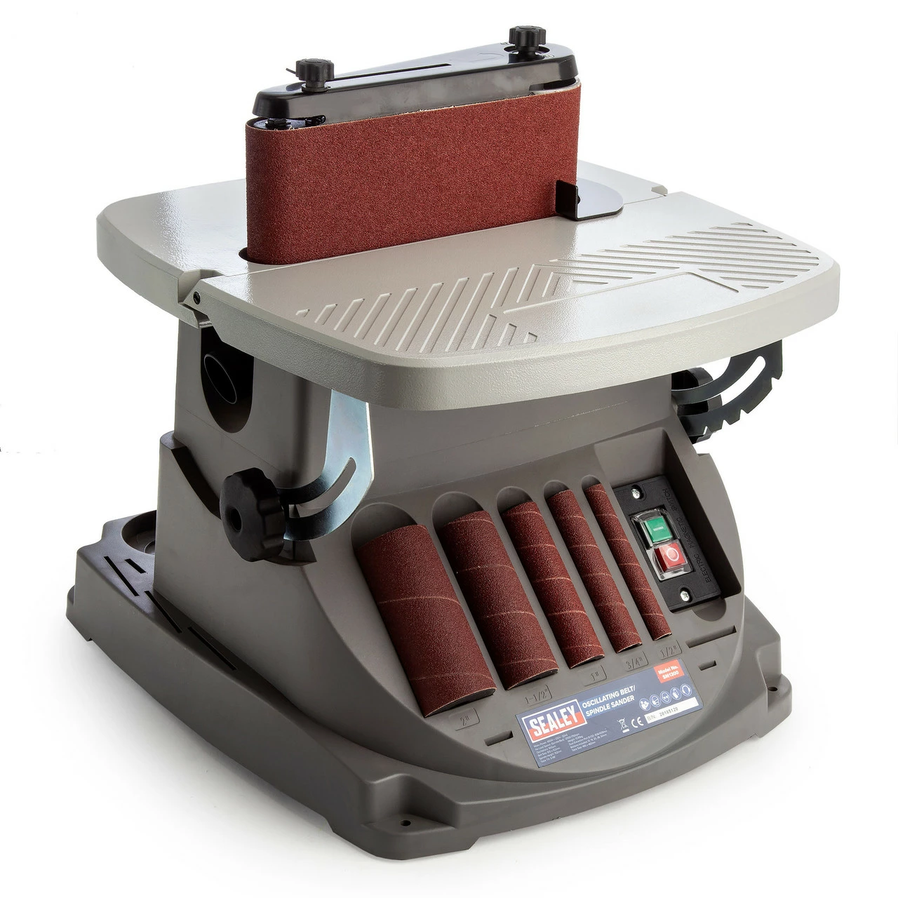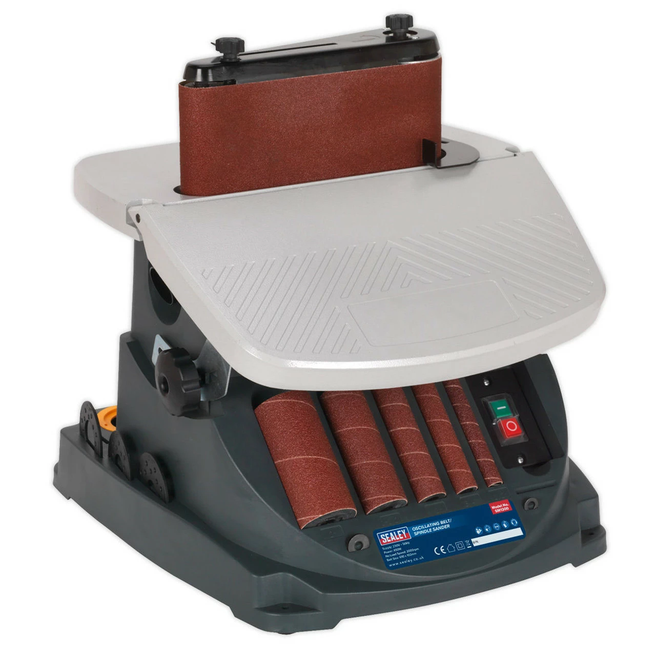 The Sealey SM1300 Oscillating Belt / Spindle Sander features a tilting front table for bevel sanding