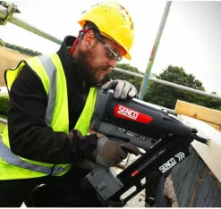 The Senco SGT90I-4VS7001N Cordless Clipped Head Gas Framing Nailer. It has a magazine capacity of 70 nails and can deliver 8000 shots on a single fully charged 7.2V, 2.5Ah battery. With a fastening driving power of 85J. Suited to truss building, framing, sub-flooring, sheathing and decks. Other applications include crate and box assembly, pallet making and fencing. Great for anywhere cordless convenience would be a benefit. The machine comes with 2 x 7.2V 2.5Ah batteries and a charger in a carry case. Gas not supplied.