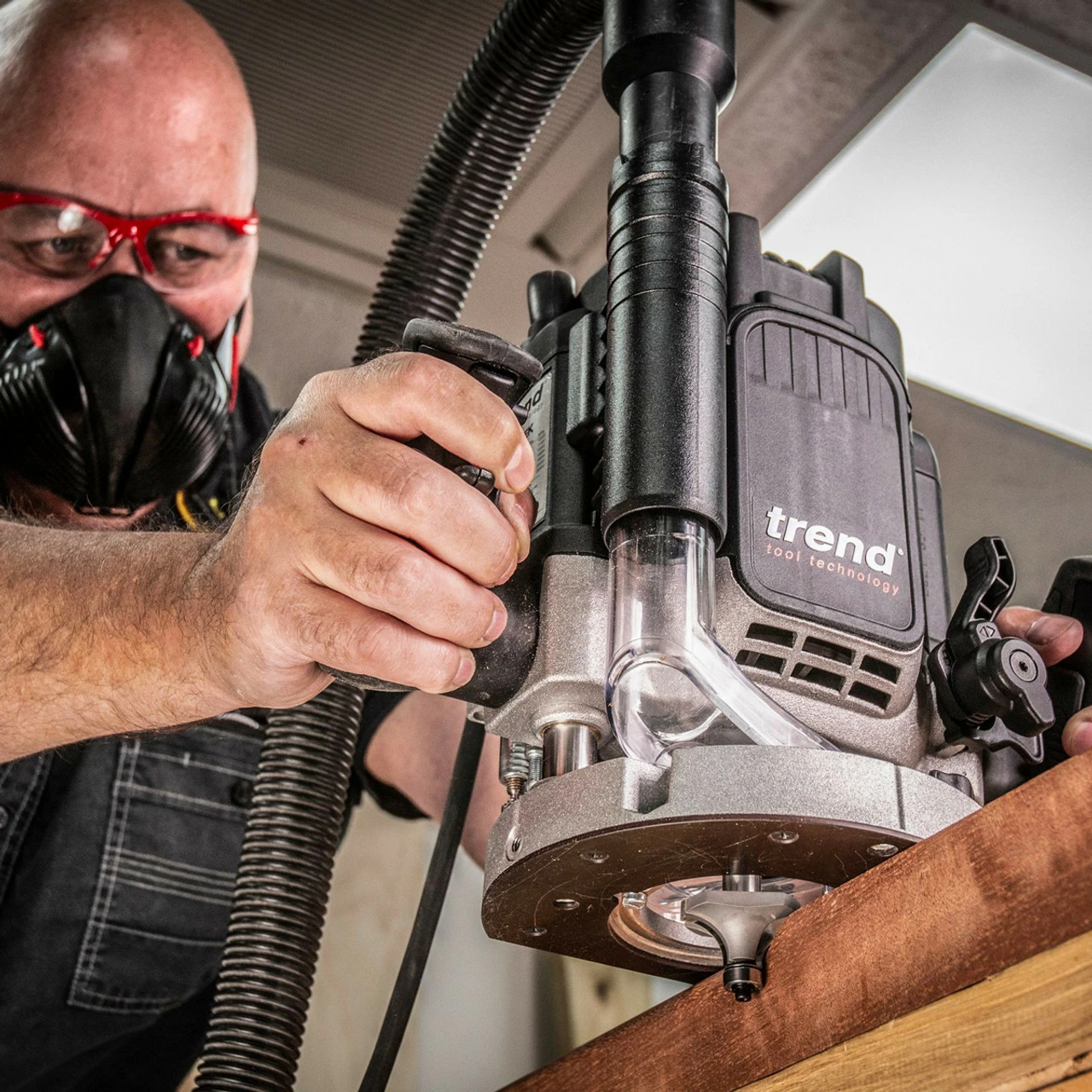 The Trend T12EK is a robust and reliable 240V Variable Speed Plunge Router with a powerful 2300W Motor, consistently delivering high power, torque and speed, and features soft-start to prevent kick-back. Fitted with Top-Mount Cyclone Extraction with enhanced dust adapter efficiently clears debris to give users 360° visibility and prevent extraction hoses from ‘snagging’. The Micrometer Fine Height Adjuster features 0.1mm increments and an easy-to-read display for precision depth adjustment. Its Phosphor Bronze Bushings are corrosion resistant, durable and self-lubricating to prevent racking and deliver a smooth, accurate plunge action. The Automatic Power Shut-Off prevents the router from accidental start-up if the trigger lock-on switch is engaged, and the power supply is lost and restored or interrupted.