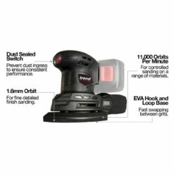 The 11 hole extraction base ensures that the full range of Trend Detail abrasives fit this sander. The dust sealed switch prevents dust ingress to ensure consistent performance every use. The rubber overmoulds reduce vibration and increase comfort for the user. Sold as a Body Only machine without battery or charger in a cardboard box.