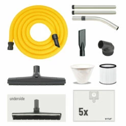 - Accessories Included – 38mm: 3m HiViz Yellow Vacuum Hose, Stainless Steel Tubes & Elbow, Crevice Tool, W&D 420m Brush Floor Cleaning Head